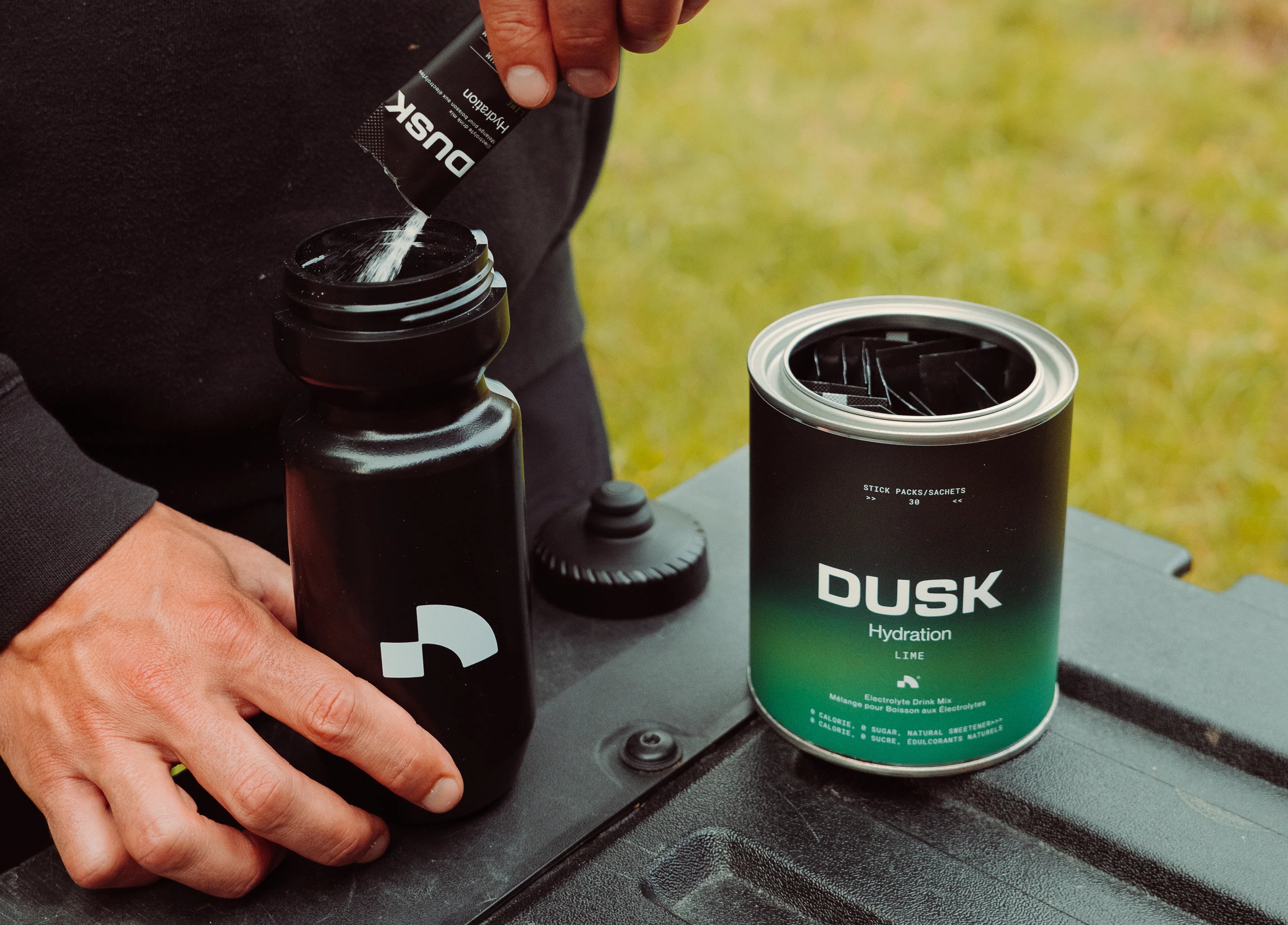 Verse une portion de Dusk Hydration dans ta bouteille d’eau, mélange, et c’est prêt.